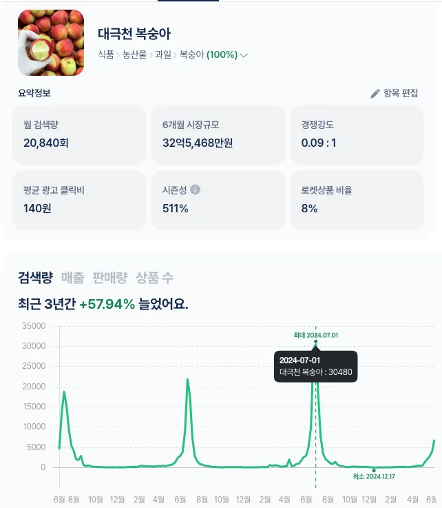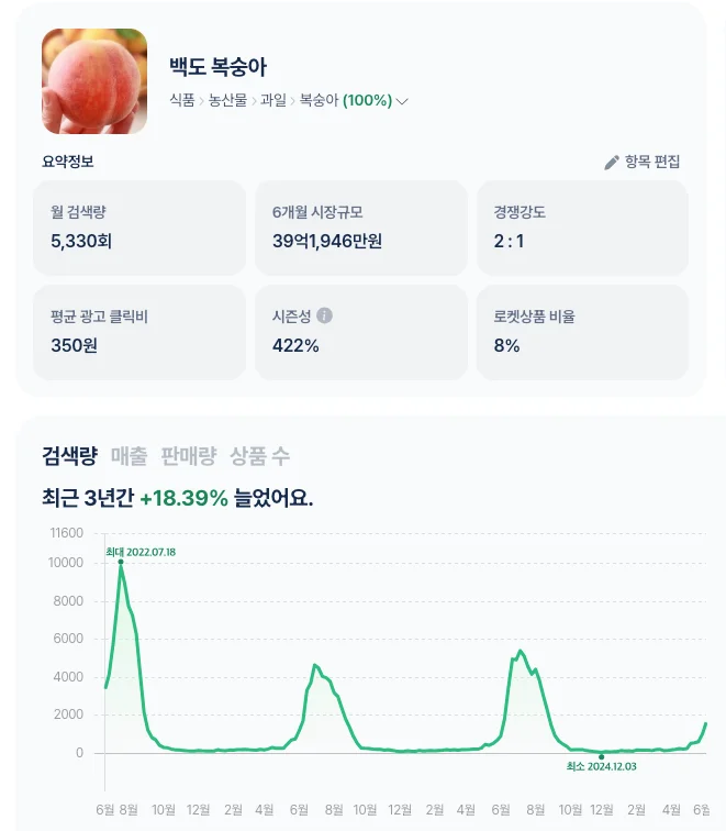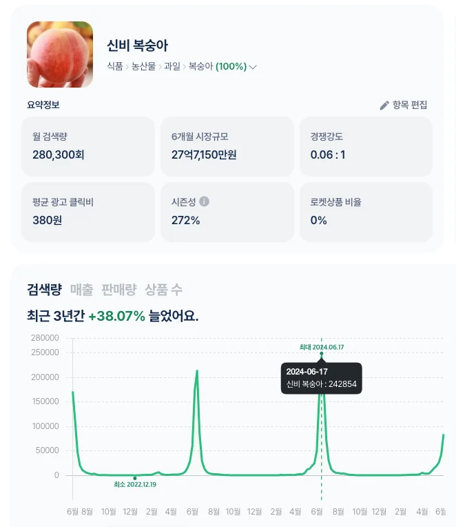 신비 복숭아는 최근 3년간 38.07% 급상승했습니다. 무려, 일간검색량이 17만 건!